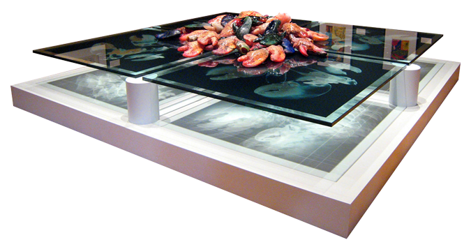 Remsen's major installation piece, Glass Claws-Pulse Point, 2007, explores the fantastic on a grand scale, using a seemingly haphazard pile of variously-colored blown-glass lobster claws as its central motif. The richly-hued and textured refuse heap levitates above the floor on cantilevered plate glass sheets, themselves infused with x-ray-cat scans of actual lobster claws.